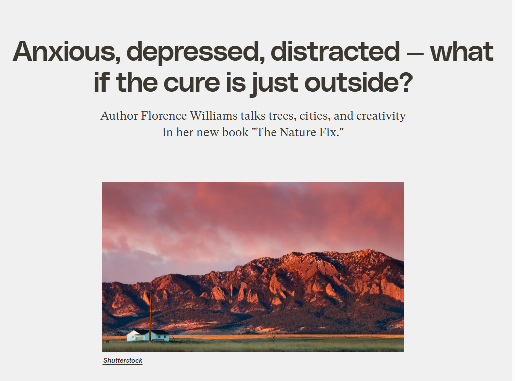 - Anxious, depressed, distracted — what if the cure is just outside? Interview with Florence Williams. Amelia Urry (2017). Grist.